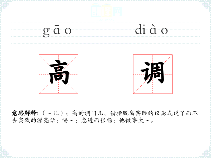 (~儿);高的调门儿,借指脱离实际的议论或说了而不去实践的漂亮话:唱~;急进而张扬:他做事太~。