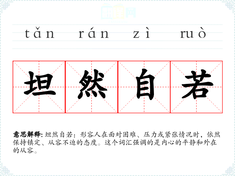 “坦然自若”是一个非常有用的词汇,它不仅描述了一种理想的心理状态,也鼓励人们在面对困难时保持冷静和自信。在语言学*和表达中,理解和运用这个词汇,可以帮助我们更好地应对生活中的各种挑战。