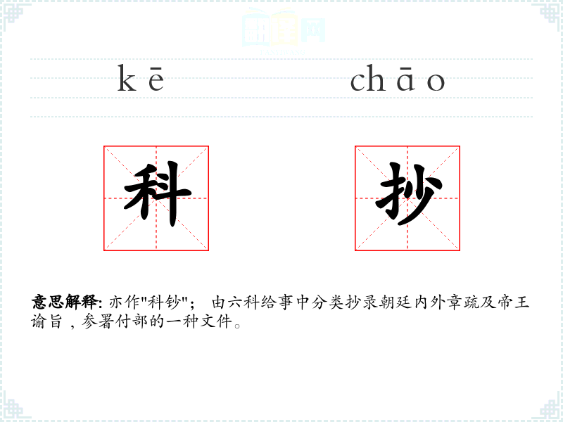 亦作"科钞"; 由六科给事中分类抄录朝廷内外章疏及帝王谕旨﹐参署付部的一种文件。