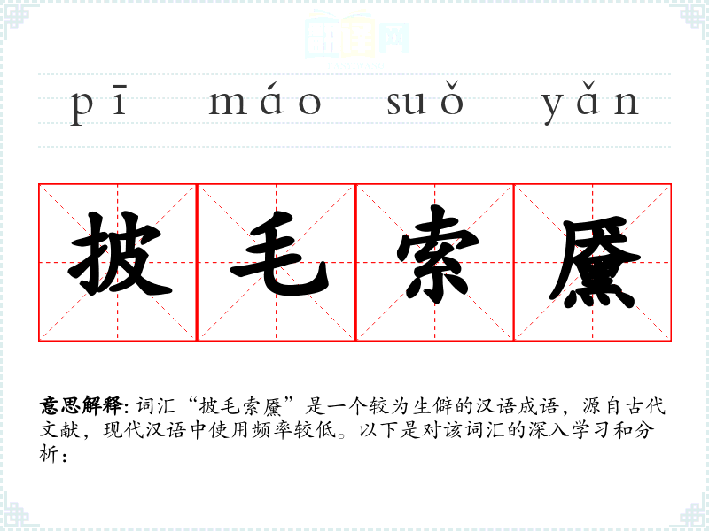 词汇“披毛索黡”是一个较为生僻的汉语成语,源自古代文献,现代汉语中使用频率较低。以下是对该词汇的深入学习和分析: