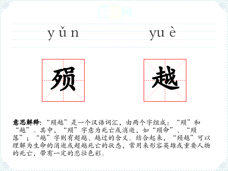 “殒越”是一个汉语词汇,由两个字组成:“殒”和“越”。其中,“殒”字意为死亡或消逝,如“殒命”、“殒落”;“越”字则有超越、越过的含义。结合起来,“殒越”可以理解为生命的消逝或超越死亡的状态,常用来形容英雄或重要人物的死亡,带有一定的悲壮色彩。