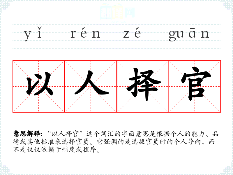 “以人择官”这个词汇的字面意思是根据个人的能力、品德或其他标准来选择官员。它强调的是选拔官员时的个人导向,而不是仅仅依赖于制度或程序。