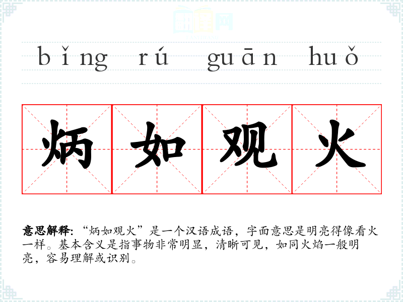 在文学作品中,“炳如观火”常用来形容事物的真相或本质非常明显,无需多言即可明了。在口语中,这个成语可能用来强调某件事情的显而易见性,或者在讨论中指出某个观点的清晰度。在专业领域,如法律或科学研究中,这个成语可以用来描述证据或数据的清晰度和可信度。