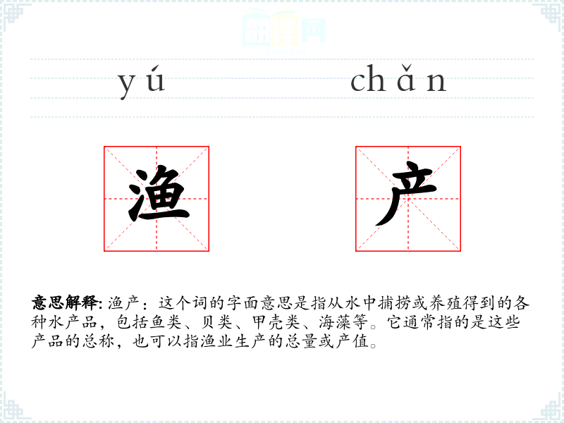 渔产:这个词的字面意思是指从水中捕捞或养殖得到的各种水产品,包括鱼类、贝类、甲壳类、海藻等。它通常指的是这些产品的总称,也可以指渔业生产的总量或产值。