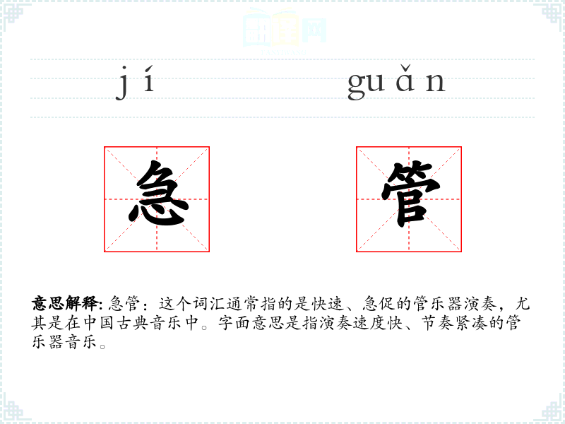急管:这个词汇通常指的是快速、急促的管乐器演奏,尤其是在**古典音乐中。字面意思是指演奏速度快、节奏紧凑的管乐器音乐。