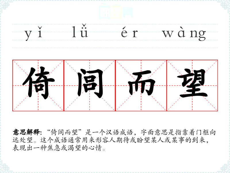 “倚闾而望”是一个汉语成语,字面意思是指靠着门框向远处望。这个成语通常用来形容人期待或盼望某人或某事的到来,表现出一种焦急或渴望的心情。