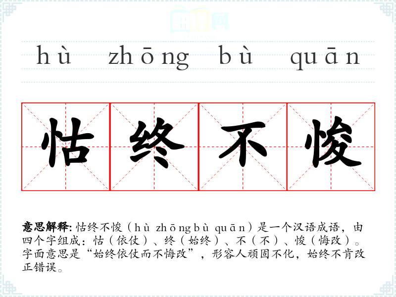 怙终不悛(hù zhōng bù quān)是一个汉语成语,由四个字组成:怙(依仗)、终(始终)、不(不)、悛(悔改)。字面意思是“始终依仗而不悔改”,形容人顽固不化,始终不肯改正错误。