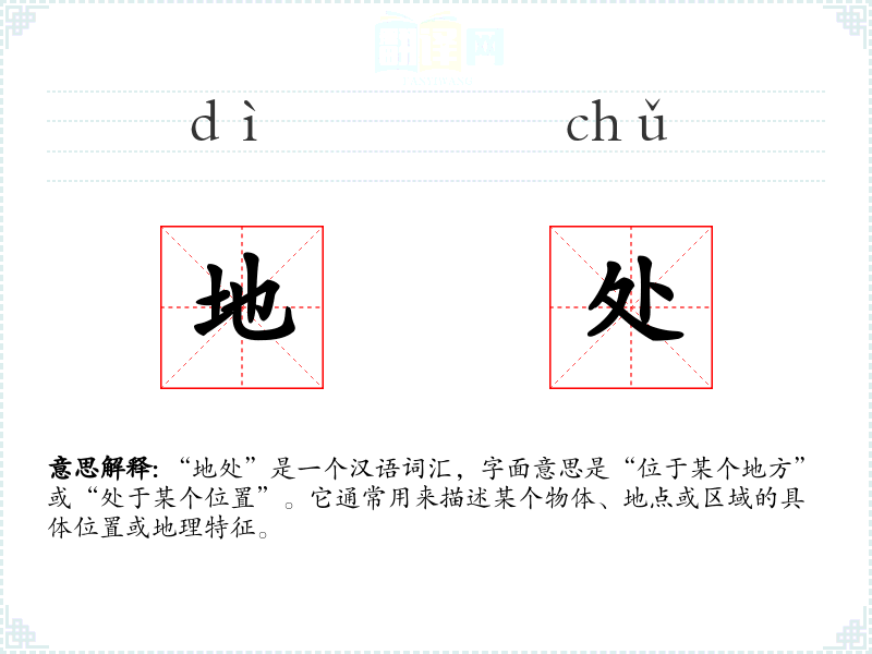 “地处”由“地”和“处”两个字组成。在古代汉语中,“地”指地面或土地,“处”指位置或状态。随着语言的发展,这两个字结合形成了描述位置的词汇。
