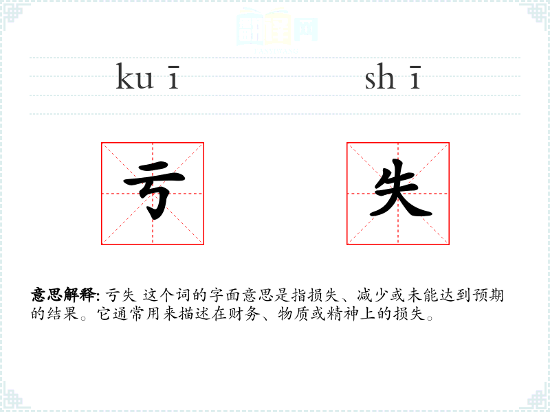 亏失 这个词的字面意思是指损失、减少或未能达到预期的结果。它通常用来描述在财务、物质或精神上的损失。