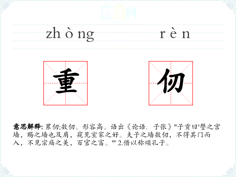 累仞;数仞。形容高。语出《论语.子张》"子贡曰'譬之宫墙,赐之墙也及肩,窥见室家之好。