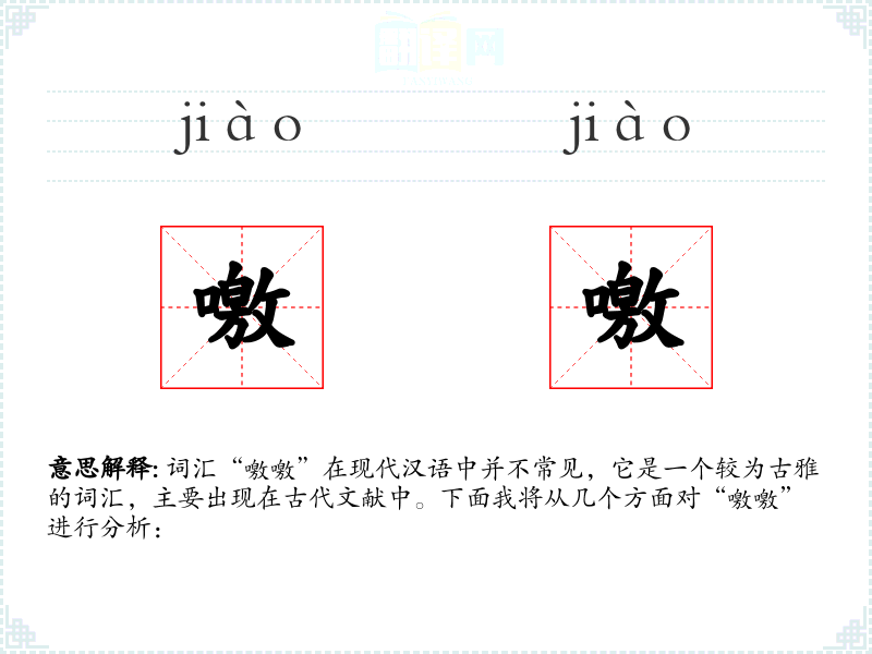 “噭噭”是一个具有鲜明听觉特征的词汇,虽然在现代汉语中使用较少,但在文学创作和学术研究中仍具有一定的价值。理解和运用这个词汇,可以丰富语言表达的层次和深度。