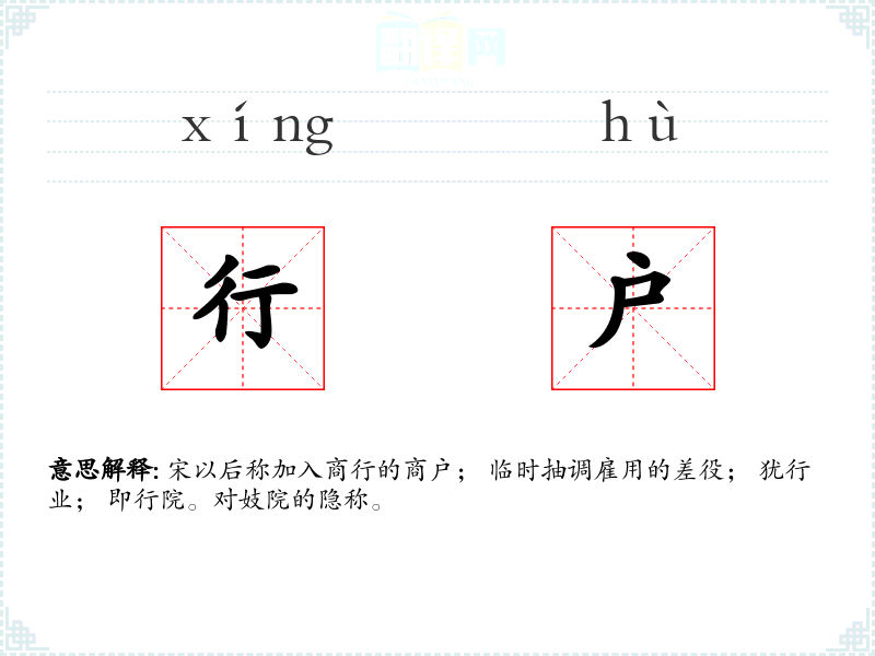 宋以后称加入商行的商户; 临时抽调雇用的差役; 犹行业; 即行院。对妓院的隐称。