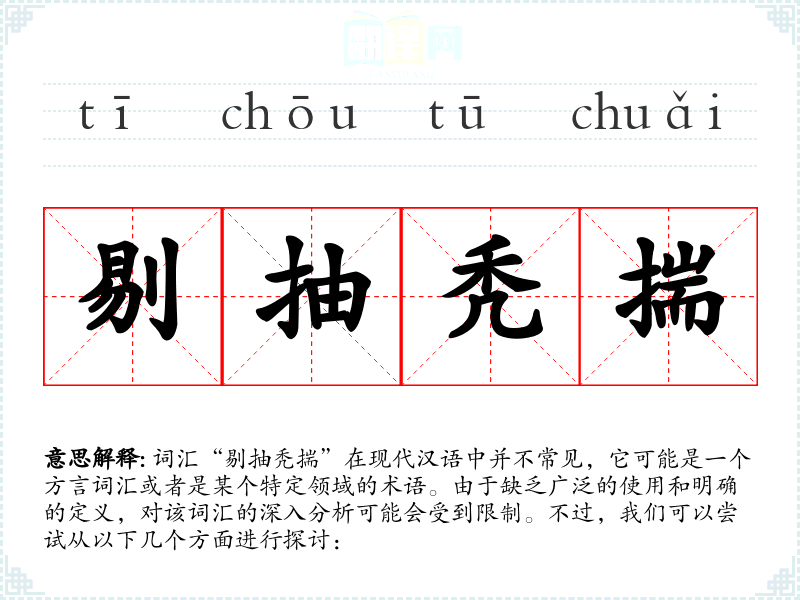 由于“剔抽秃揣”不是一个标准汉语词汇,我们无法提供一个确切的字面意思和基本含义。它可能是由几个汉字组合而成的,每个字都有自己的意义,但组合在一起可能表达一个特定的概念或动作。