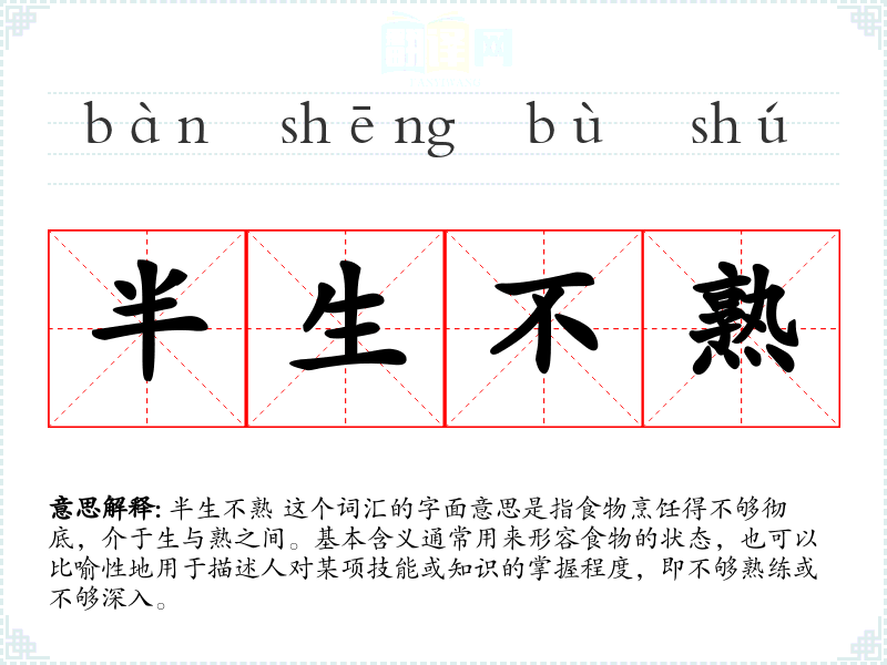 半生不熟 这个词汇的字面意思是指食物烹饪得不够彻底,介于生与熟之间。基本含义通常用来形容食物的状态,也可以比喻性地用于描述人对某项技能或知识的掌握程度,即不够熟练或不够深入。