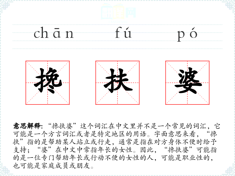 由于“搀扶婆”是一个特定且不常见的词汇,它在不同语言或文化中的对应词汇可能不存在。但如果要比较,可以考虑其他文化中类似的角色,如日本的“介護士”(护理员)或西方的“caregiver”(照顾者)。