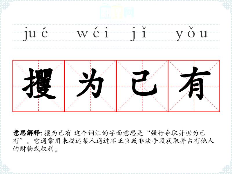 攫为己有 这个词汇的字面意思是“强行夺取并据为己有”。它通常用来描述某人通过不正当或非法手段获取并占有他人的财物或权利。