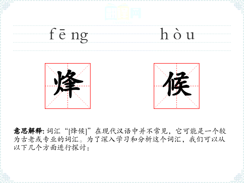 词汇“[烽候]”在现代汉语中并不常见,它可能是一个较为古老或专业的词汇。为了深入学*和分析这个词汇,我们可以从以下几个方面进行探讨: