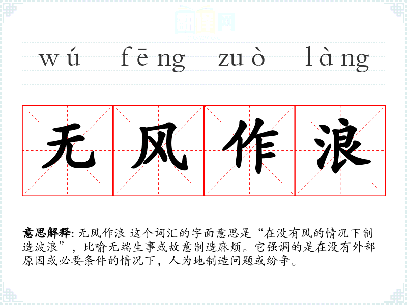 无风作浪 这个词汇的字面意思是“在没有风的情况下制造波浪”,比喻无端生事或故意制造麻烦。它强调的是在没有外部原因或必要条件的情况下,人为地制造问题或纷争。