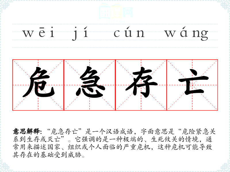 “危急存亡”是一个汉语成语,字面意思是“危险紧急关系到生存或灭亡”。它强调的是一种极端的、生死攸关的情境,通常用来描述国家、组织或个人面临的严重危机,这种危机可能导致其存在的基础受到威胁。