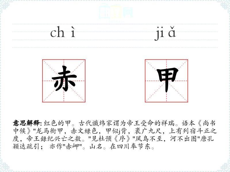 1.红色的甲。古代谶纬家谓为帝王受命的祥瑞。语本《尚书中候》"龙马衔甲,赤文緑色,甲似j背,袤广九尺,上有列宿斗正之度,帝王録纪兴亡之数。"见杜预《序》"凤鸟不至,河不出图"唐孔颖达疏引; 亦作"赤岬"。山名。在四川奉节东。