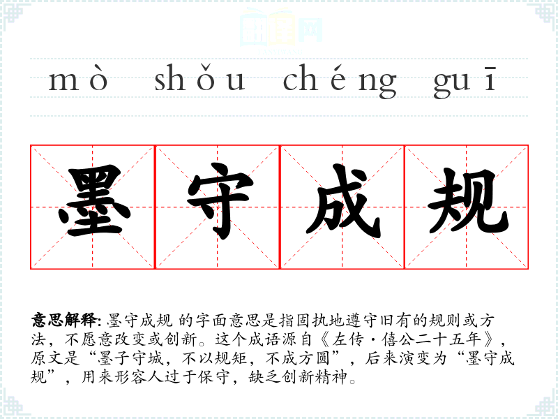 墨守成规 的字面意思是指固执地遵守旧有的规则或方法,不愿意改变或创新。这个成语源自《左传·僖公二十五年》,原文是“墨子守城,不以规矩,不成方圆”,后来演变为“墨守成规”,用来形容人过于保守,缺乏创新精神。