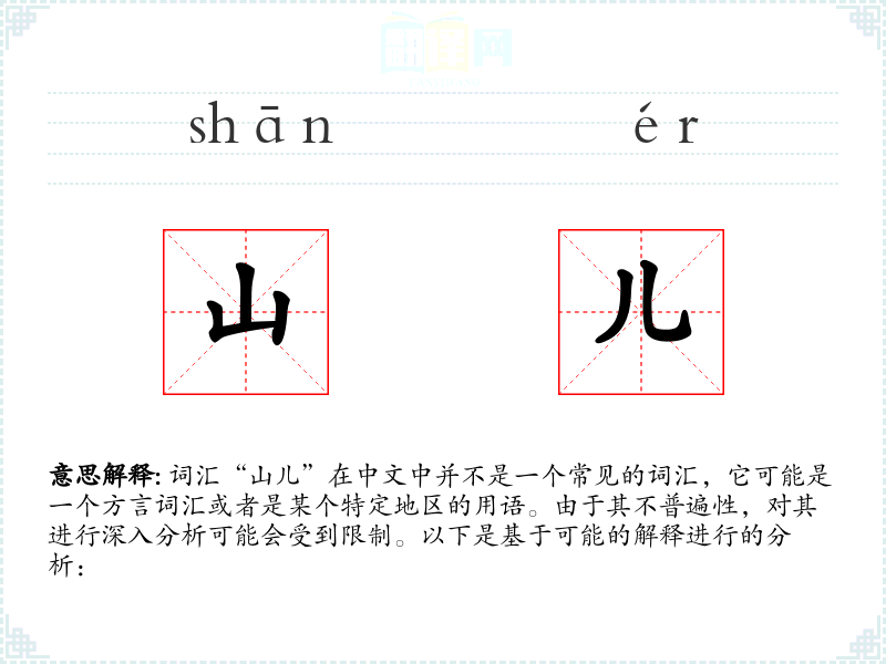 “山儿”可能是一个方言词汇,用来指代“山”或者“山丘”。在某些方言中,“儿”字可以作为名词的后缀,用来表示亲切或者小巧的意味。因此,“山儿”可能指的是一个小山或者对山的亲切称呼。