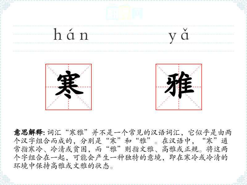 - 文学:在文学作品中,“寒雅”可能用来形容人物在逆境中依然保持的高尚品质或行为。