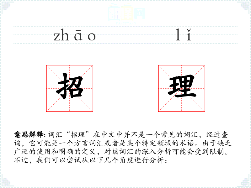 由于“招理”不是一个标准的中文词汇,我们无法给出一个确切的基本定义。它可能是某个地方方言中的词汇,或者是某个行业内部的术语。