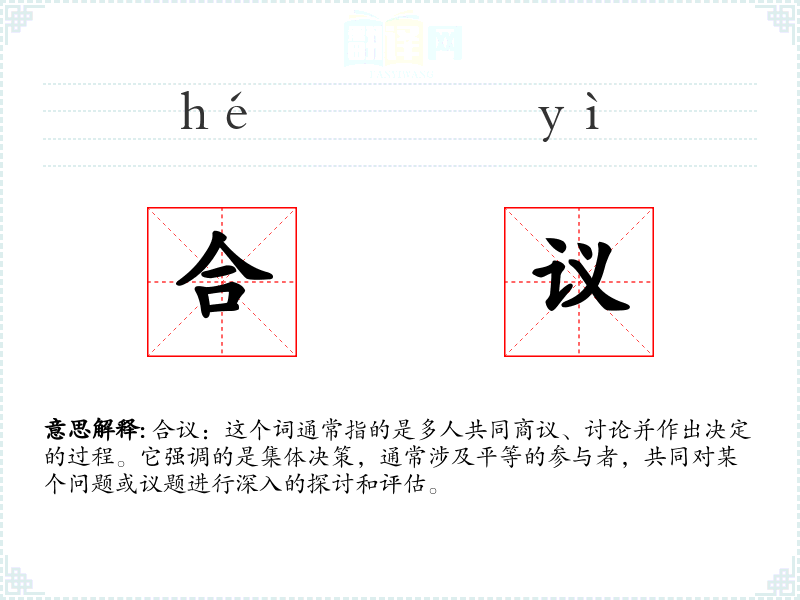 合议:这个词通常指的是多人共同商议、讨论并作出决定的过程。它强调的是集体决策,通常涉及平等的参与者,共同对某个问题或议题进行深入的探讨和评估。