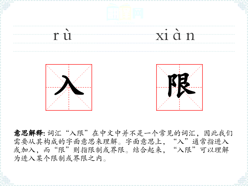 词汇“入限”在中文中并不是一个常见的词汇,因此我们需要从其构成的字面意思来理解。字面意思上,“入”通常指进入或加入,而“限”则指限制或界限。结合起来,“入限”可以理解为进入某个限制或界限之内。