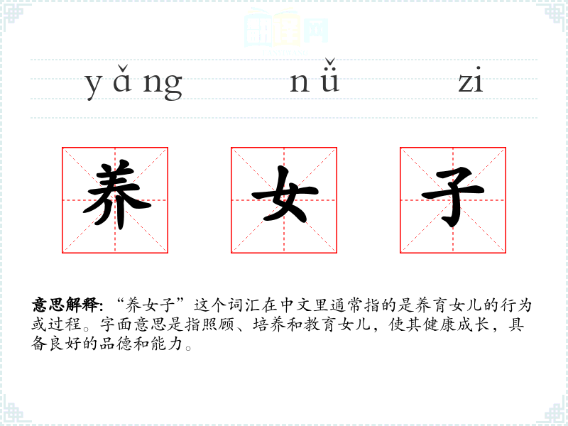 “养女子”这个词汇在中文里通常指的是养育女儿的行为或过程。字面意思是指照顾、培养和教育女儿,使其健康成长,具备良好的品德和能力。