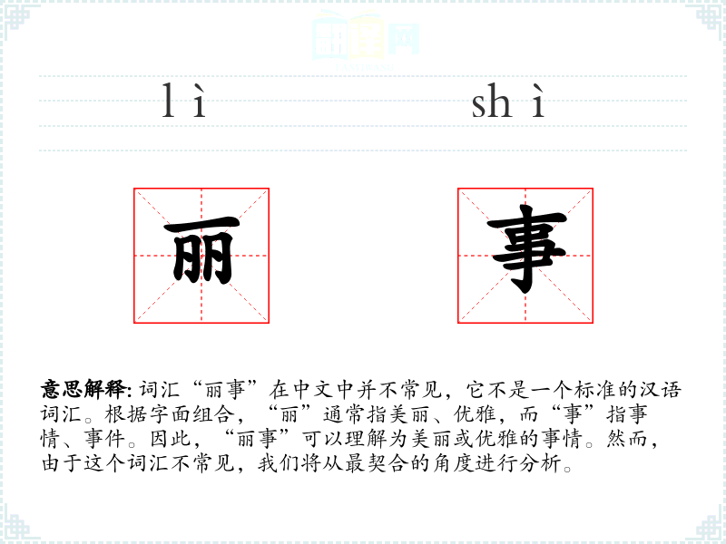 “丽事”可以解释为美丽或优雅的事情,通常指那些令人愉悦、赏心悦目的**或活动。
