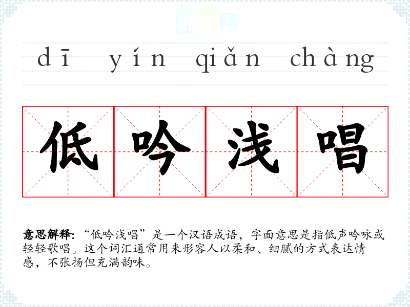 “低吟浅唱”是一个汉语成语,字面意思是指低声吟咏或轻轻歌唱。这个词汇通常用来形容人以柔和、细腻的方式表达情感,不张扬但充满韵味。