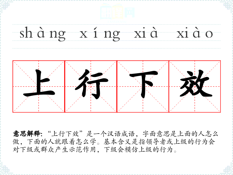 “上行下效”是一个汉语成语,字面意思是上面的人怎么做,下面的人就跟着怎么学。基本含义是指领导者或上级的行为会对下级或群众产生示范作用,下级会模仿上级的行为。