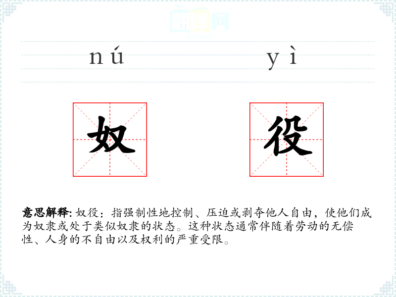 奴役:指强制性地控制、压迫或剥夺他人自由,使他们成为奴隶或处于类似奴隶的状态。这种状态通常伴随着劳动的无偿性、人身的不自由以及权利的严重受限。