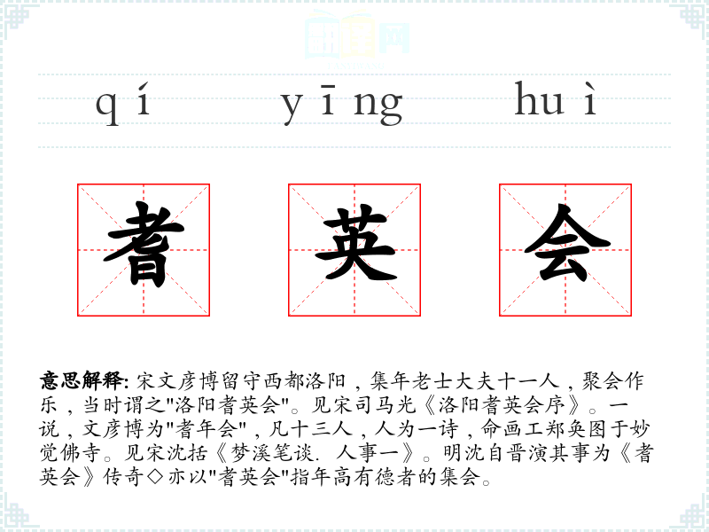 1.宋文彦博留守西都洛阳﹐集年老士大夫十一人﹐聚会作乐﹐当时谓之"洛阳耆英会"。见宋司马光《洛阳耆英会序》。一说﹐文彦博为"耆年会"﹐凡十三人﹐人为一诗﹐命画工郑奂图于妙觉佛寺。见宋沈括《梦溪笔谈.人事一》。明沈自晋演其事为《耆英会》传奇◇亦以"耆英会"指年高有德者的集会。