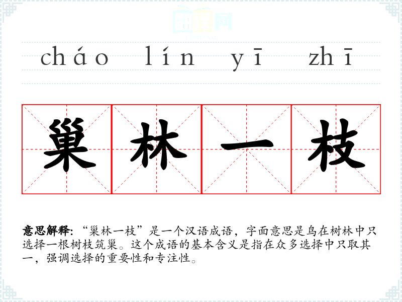 “巢林一枝”是一个汉语成语,字面意思是鸟在树林中只选择一根树枝筑巢。这个成语的基本含义是指在众多选择中只取其一,强调选择的重要性和专注性。