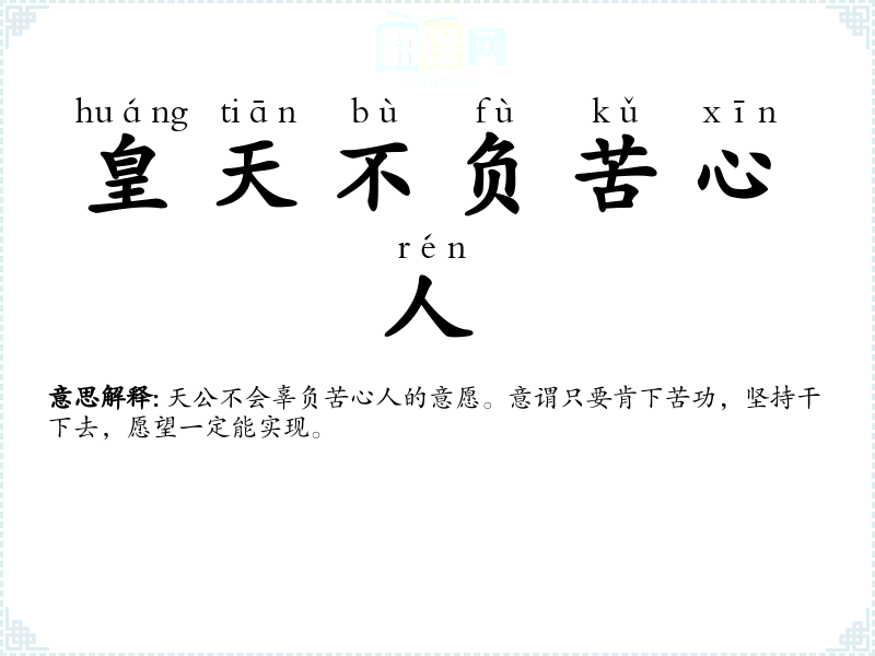 天公不会辜负苦心人的意愿。意谓只要肯下苦功,坚持干下去,愿望一定能实现。