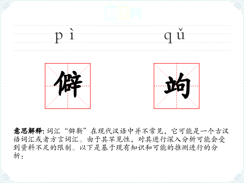 “僻”字在古汉语中意为偏僻、不常见,“靳”字则有保守、吝啬的含义。这两个字的结合可能是后来形成的词汇,具体的词源和演变过程需要查阅更多的古汉语资料。