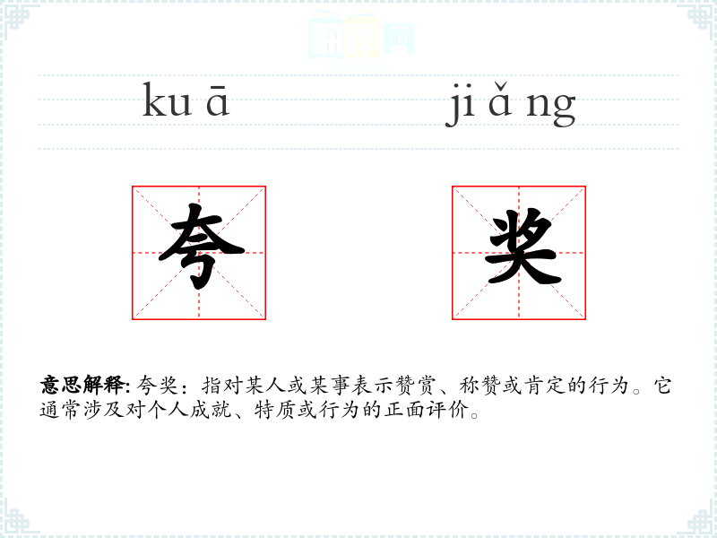- 词源:“夸奖”一词源于古代汉语,其中“夸”意为夸大或赞美,“奖”意为奖励或鼓励。