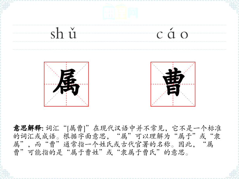 词汇“[属曹]”在现代汉语中并不常见,它不是一个标准的词汇或成语。根据字面意思,“属”可以理解为“属于”或“隶属”,而“曹”通常指一个姓氏或古代官署的名称。因此,“属曹”可能指的是“属于曹姓”或“隶属于曹氏”的意思。
