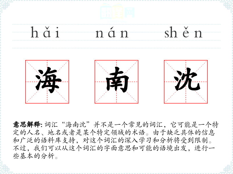 词汇“海南沈”并不是一个常见的词汇,它可能是一个特定的人名、地名或者是某个特定领域的术语。由于缺乏具体的信息和广泛的语料库支持,对这个词汇的深入学*和分析将受到限制。不过,我们可以从这个词汇的字面意思和可能的语境出发,进行一些基本的分析。