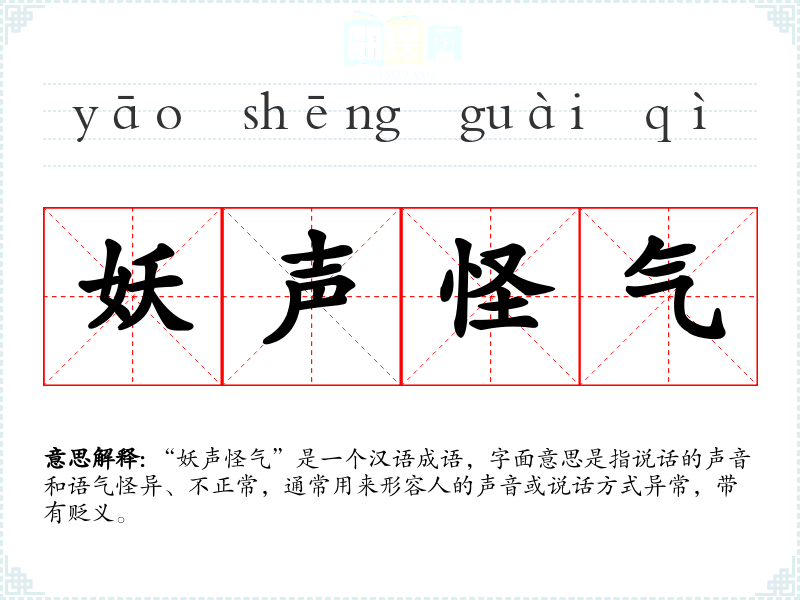 “妖声怪气”是一个汉语成语,字面意思是指说话的声音和语气怪异、不正常,通常用来形容人的声音或说话方式异常,带有贬义。