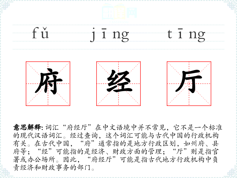 - 词源:府(地方行政区划)+ 经(经济、财政)+ 厅(官署、办公场所)