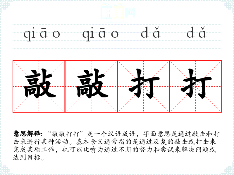 “敲敲打打”是一个汉语成语,字面意思是通过敲击和打击来进行某种活动。基本含义通常指的是通过反复的敲击或打击来完成某项工作,也可以比喻为通过不断的努力和尝试来解决问题或达到目标。