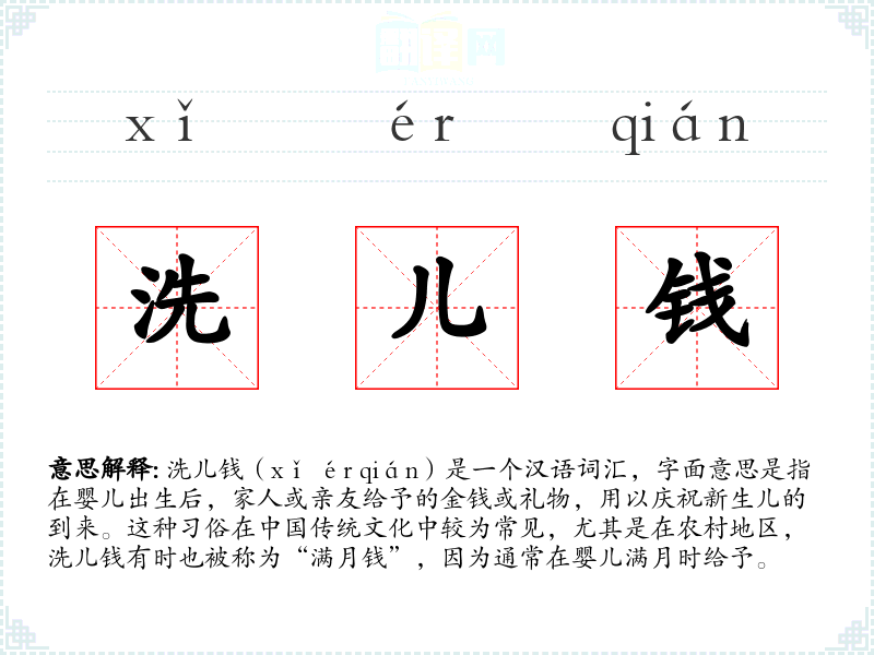 洗儿钱(xǐ ér qián)是一个汉语词汇,字面意思是指在婴儿出生后,家人或亲友给予的金钱或礼物,用以庆祝新生儿的到来。这种*俗在**传统文化中较为常见,尤其是在农村地区,洗儿钱有时也被称为“满月钱”,因为通常在婴儿满月时给予。