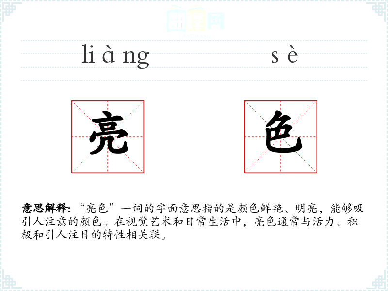 - 口语:在日常对话中,人们可能会用“亮色”来形容服装或装饰品的色彩,如“她今天穿了一件亮色的外套,非常抢眼”。