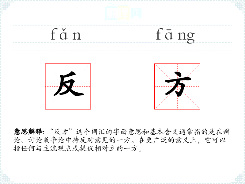 “反方”这个词汇的字面意思和基本含义通常指的是在辩论、讨论或争论中持反对意见的一方。在更广泛的意义上,它可以指任何与主流观点或提议相对立的一方。