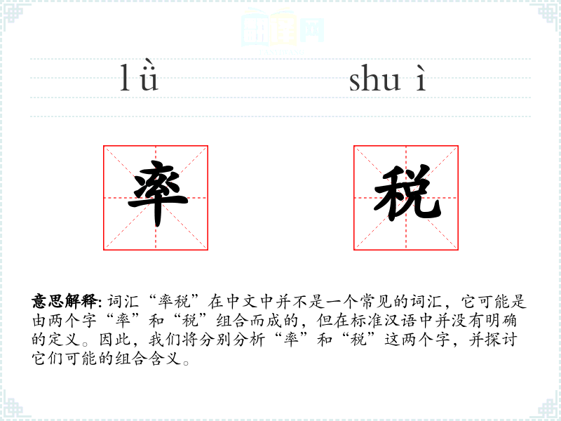 词汇“率税”在中文中并不是一个常见的词汇,它可能是由两个字“率”和“税”组合而成的,但在标准汉语中并没有明确的定义。因此,我们将分别分析“率”和“税”这两个字,并探讨它们可能的组合含义。