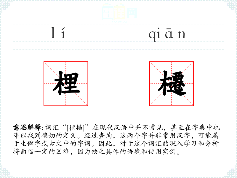 综上所述,词汇“[梩描]”在现代汉语中并不常见,缺乏具体的使用实例和语境,因此难以进行深入的学习和分析。如果这个词汇来源于特定的古文或专业领域,可能需要更专业的文献或专家来解析。